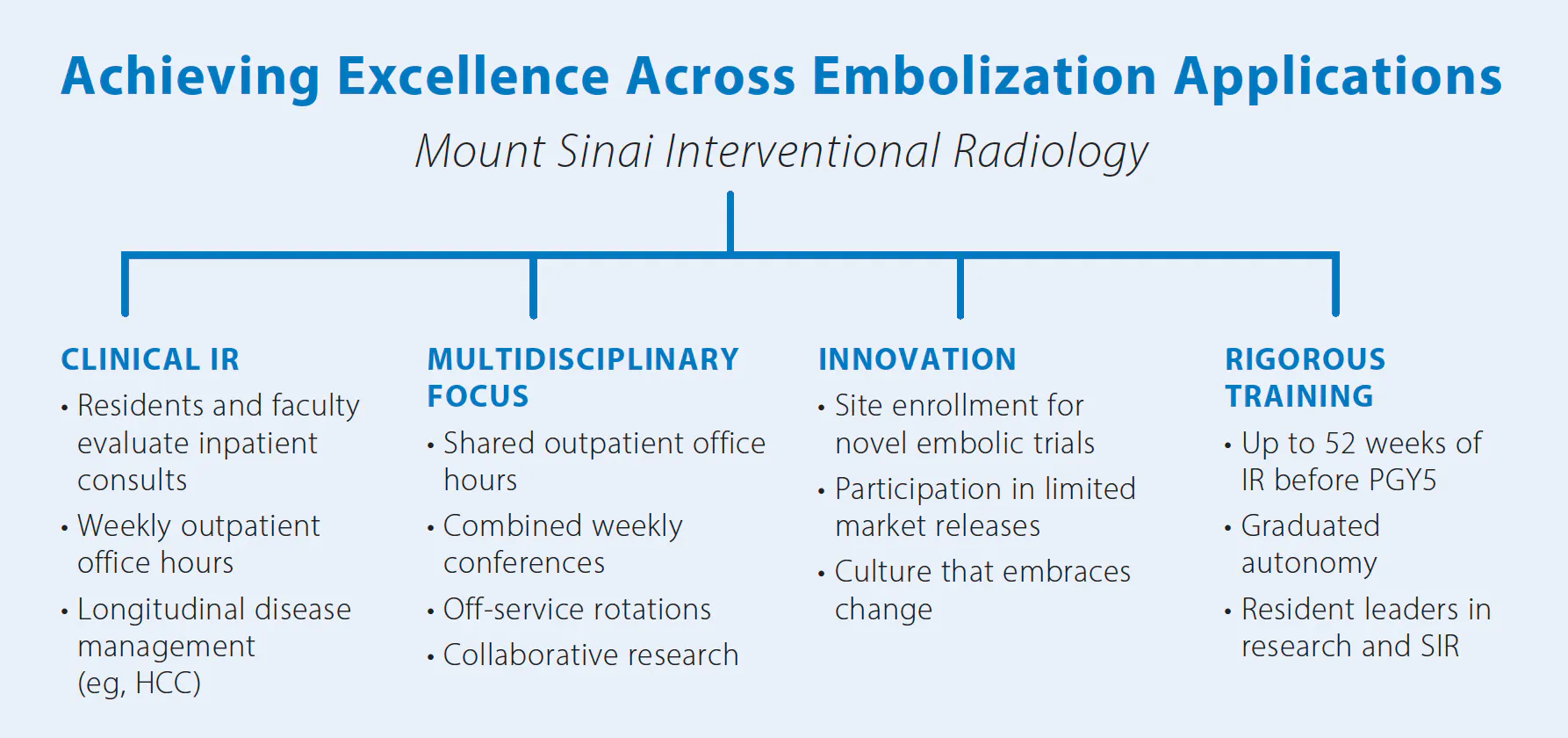Figure 1. Pillars of the IR division at Mount Sinai Hospital in New York, New York. The Mount Sinai IR team has made a commitment to clinical IR, multidisciplinary collaboration, innovation, and trainee education. These pillars form the foundation for achieving excellence across embolization applications. PGY5, postgraduate year 5; SIR, Society of Interventional Radiology.