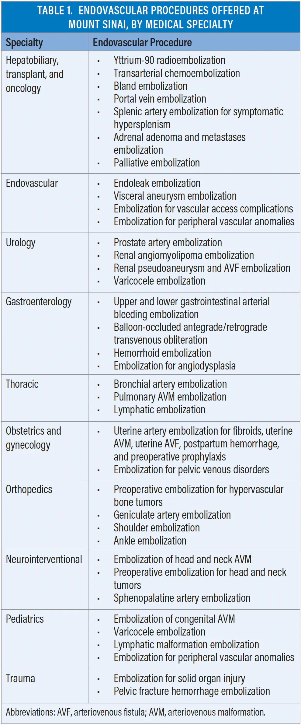The interventional radiology (IR) embolization service at Mount Sinai reflects the demands of a large, urban health system. These demands include managing a range of case acuity, collaborating with multiple specialties, and delivering high-volume procedural care while maintaining rigorous clinical standards. Emergent procedures range from embolization for postpartum and gastrointestinal (GI) hemorrhage to bronchial artery embolization for massive hemoptysis, among others. Elective embolization represents an equally important component of the practice and includes prostate artery embolization (PAE), uterine fibroid embolization, musculoskeletal embolization, oncologic embolization therapies, treatment of pelvic venous disorders, and management of vascular malformations (Table 1). The diversity of our caseload requires fluency across a spectrum of embolic agents, each selected for precise clinical indications and technical considerations (Table 2).