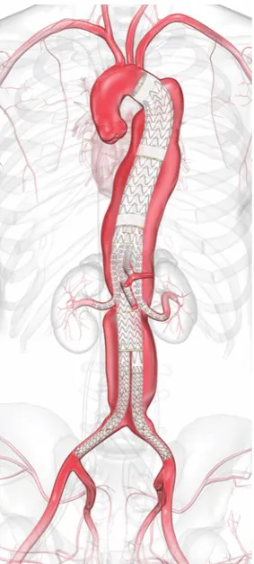 The aortic component includes four portals with a precannulation system for visceral branches, facilitating placement of branch components (Gore Viabahn VBX balloon-expandable endoprosthesis) to maintain perfusion to visceral organs. Its multistage deployment system allows for intraoperative repositioning and directional adjustment.